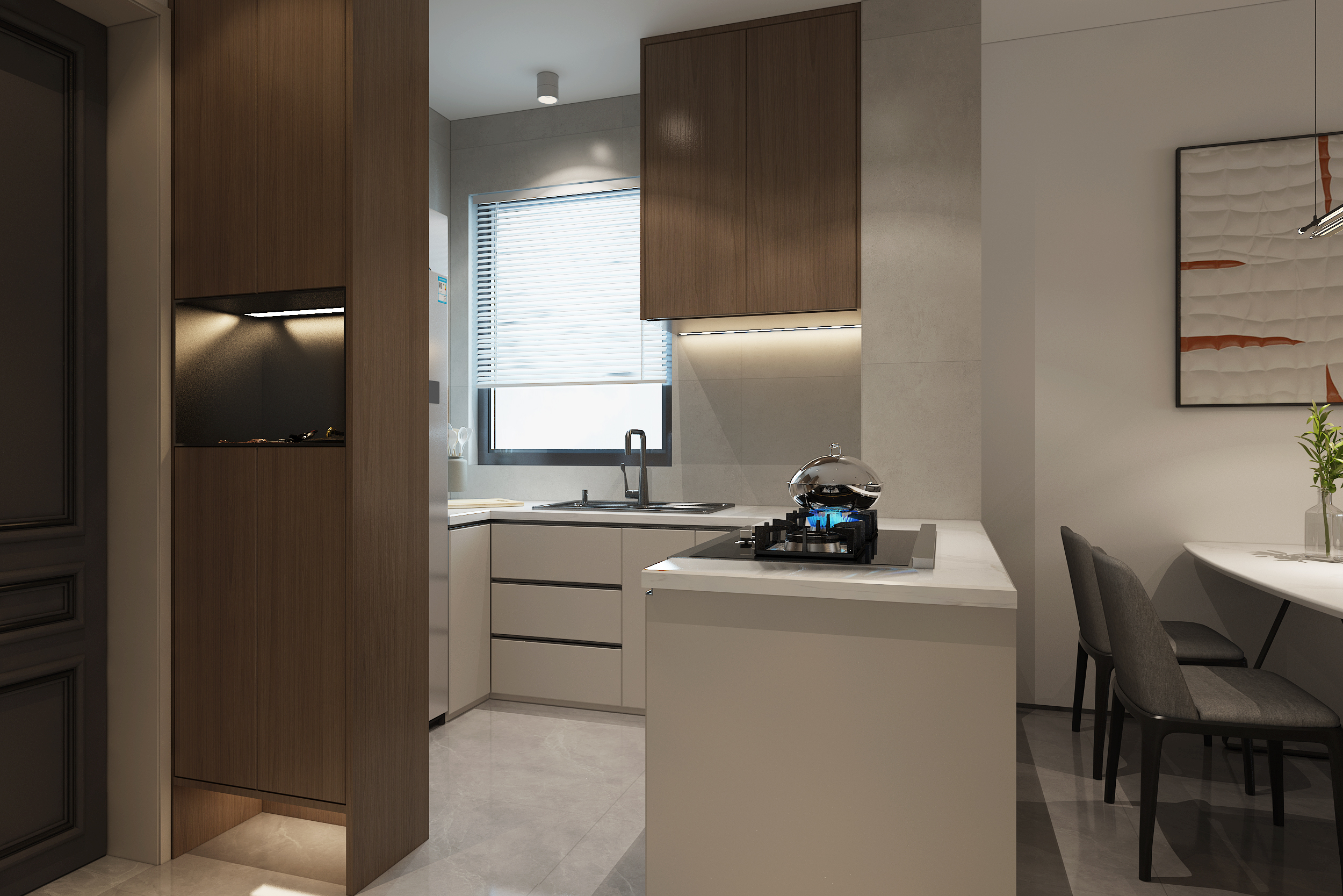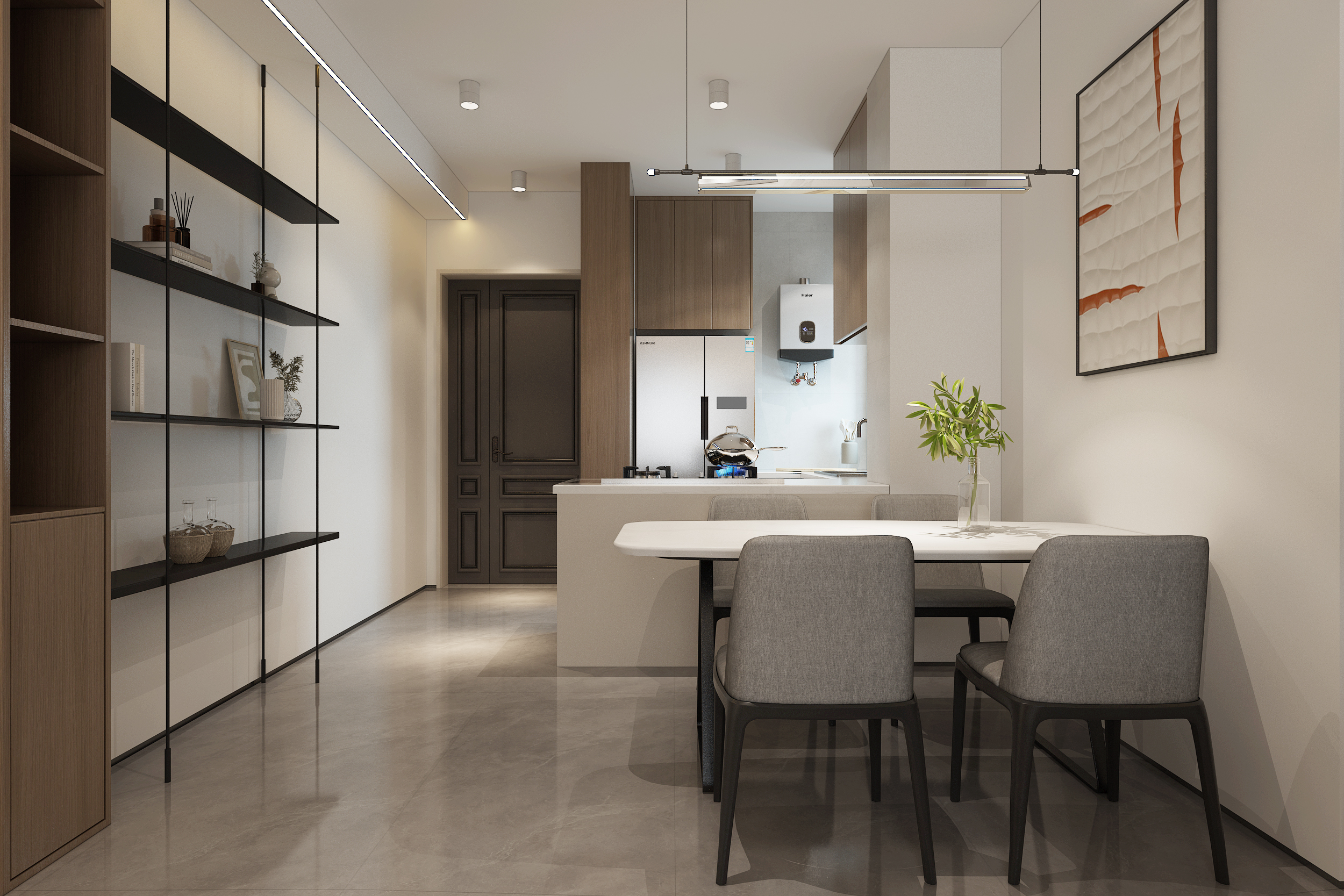 走廊放置了玄关柜,和客厅风格一致,同时也巧妙的分开了走廊和厨房,使整个空间相互呼应。