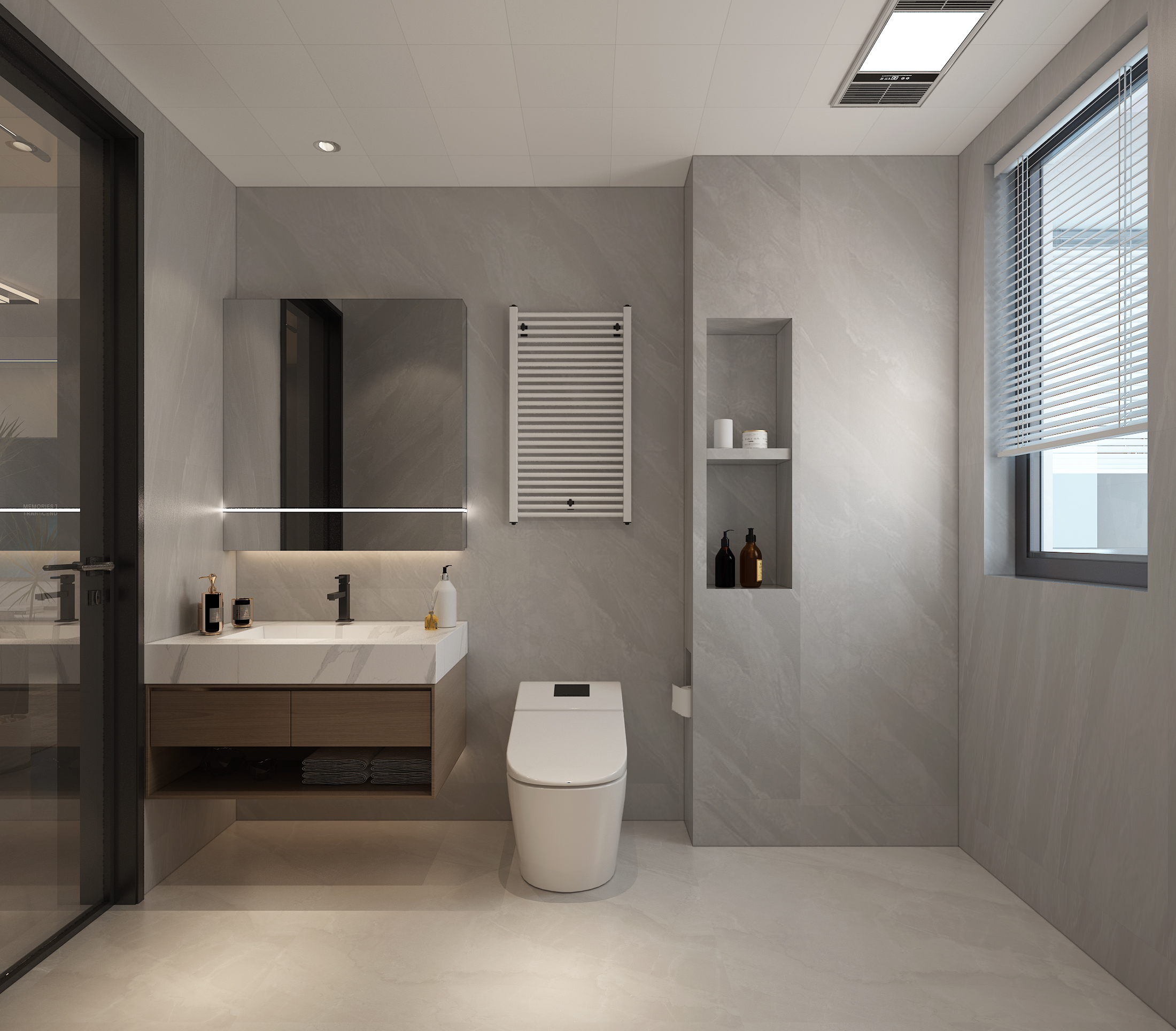 卫生间墙壁采用灰色带白条纹瓷砖和地面一致,看上去利落大方。整体分享到这里啦